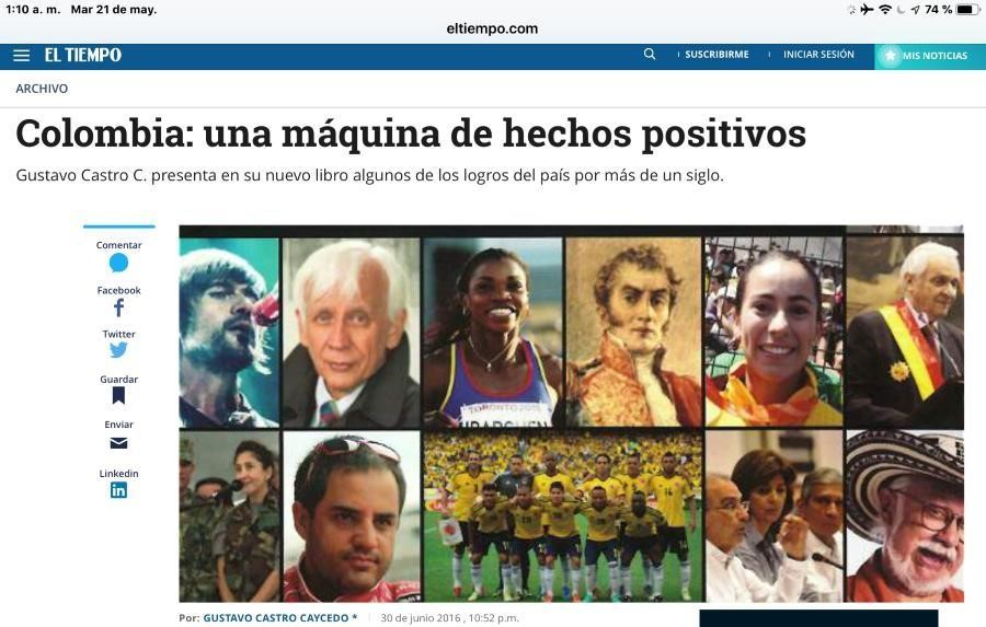 Por contraste, en mi libro, “Por qué me quedé en Colombia”, varios personajes extranjeros famosos, de distintos países, cuentan por qué se enamoraron del nuestro y alaban la calidad humana y la calidez de nuestra gente, cultura, costumbres y tradiciones, hospitalidad y, claro, la música, el folclor, los paisajes, los sitios, las comidas de Colombia y muchas cosas más.